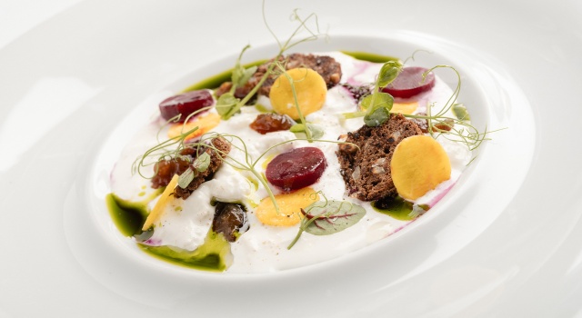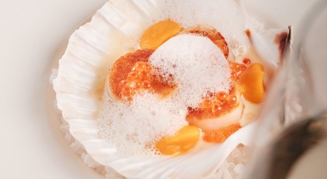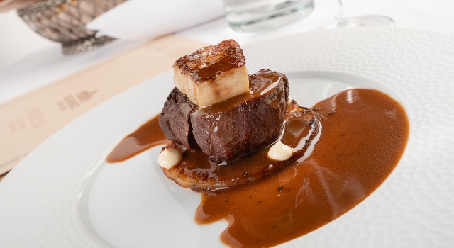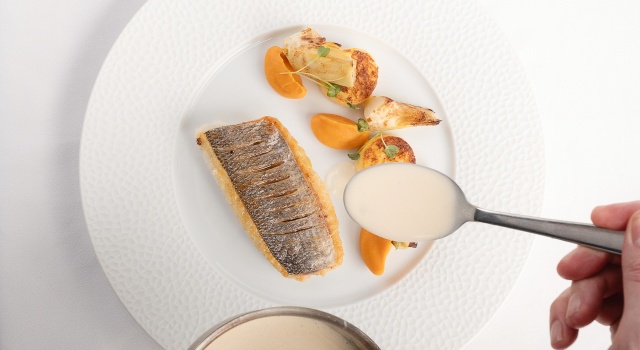 Pečený filet z pražmy královské, květákové pyré, kapary, ravioli, kmínový sabayon 350,-