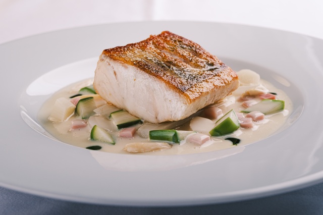 150 g Pošírovaná treska, hrášek se slaninou a česnekem, pečené grenaille 295 Kč